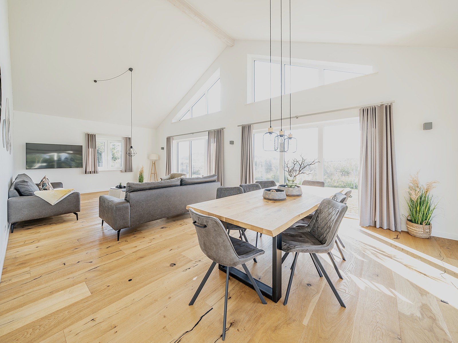 Der lichtdurchflutete Wohnbereich lädt zum gemeinsamen Kochen, Essen und Entspannen ein. Die sechs Schlafzimmer und vier Bäder bieten genügend Rückzugsorte für alle. Ein Highlight ist die hauseigene Sauna, die nach einem Spaziergang am Meer für wohlige Wärme sorgt.