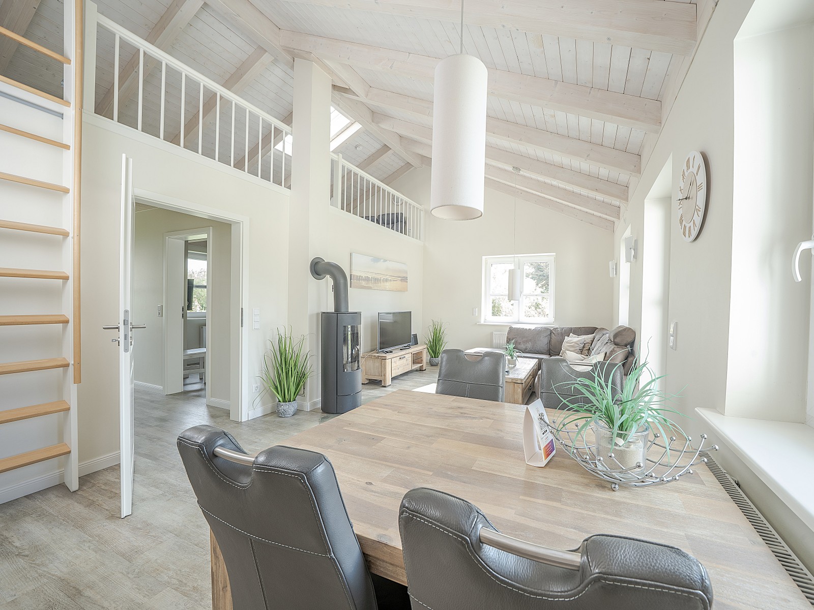 Der helle Wohn- und Essbereich mit offener Küche, bequemer Sofaecke und Kaminofen sorgt für Wohlfühlatmosphäre zu jeder Jahreszeit. Das Schlafzimmer ist mit einem Doppelbett ausgestattet, das Badezimmer verfügt über eine Fußbodenheizung.