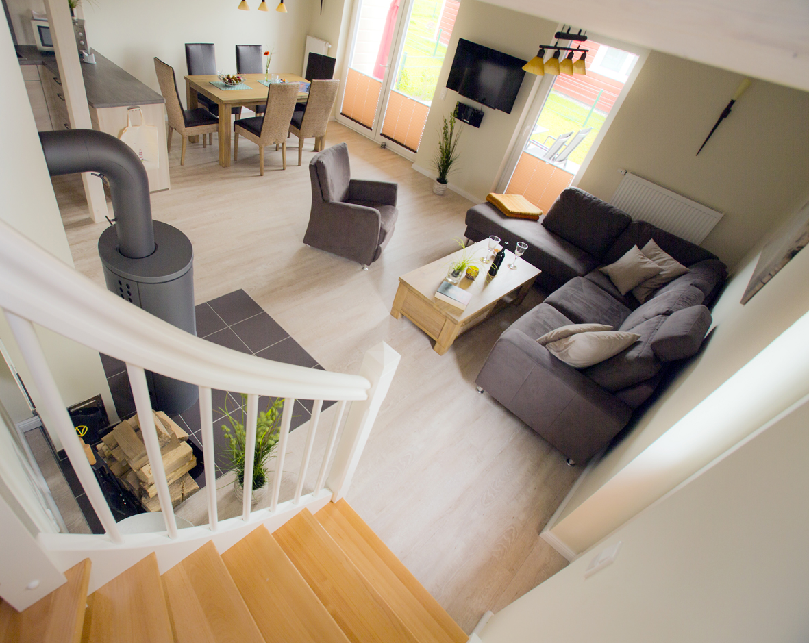 Im Erdgeschoss erwartet Sie eine vollausgestattete offene Küche, ein großzügiger Essbereich, eine kuschelige Sofalandschaft und ein dänischer Kaminofen. Durch breite Türen lässt sich das Wohnzimmer im Nu zur überdachten Terasse erweitern. Im Schlafzimmer befindet sich ein extra breites 1,20 m Einzelbett. Das Bad hat eine Dusche ohne Einstiegsschwellen.