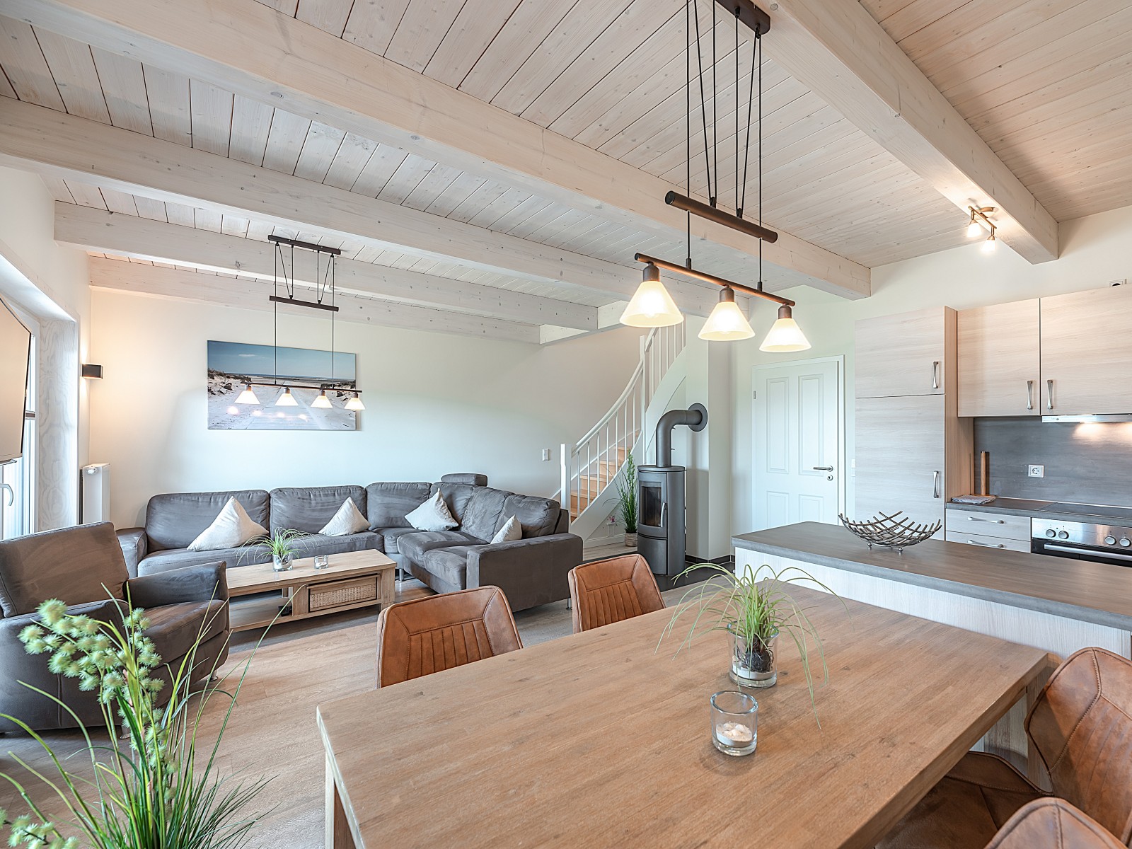 Das Herzstück ist der offene Wohnbereich mit gemütlicher Sofalandschaft, Kaminofen und voll ausgestatteter Küche. Im Erdgeschoss befindet sich ein Schlafzimmer mit breitem Einzelbett sowie ein Bad mit schwellenloser Dusche – ideal für Gäste, die Treppen vermeiden möchten.